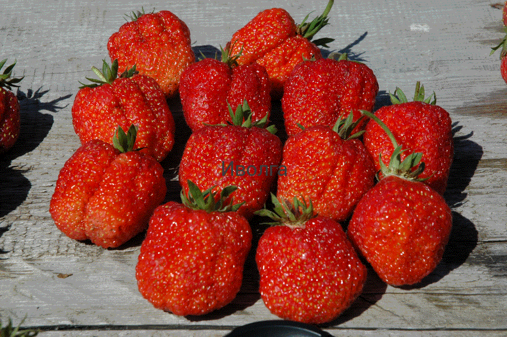 Ягоды крупные, имеют сладкий вкус, по форме коническая, немного сплюснутая, некоторые ягодки трапециевидной формы.
