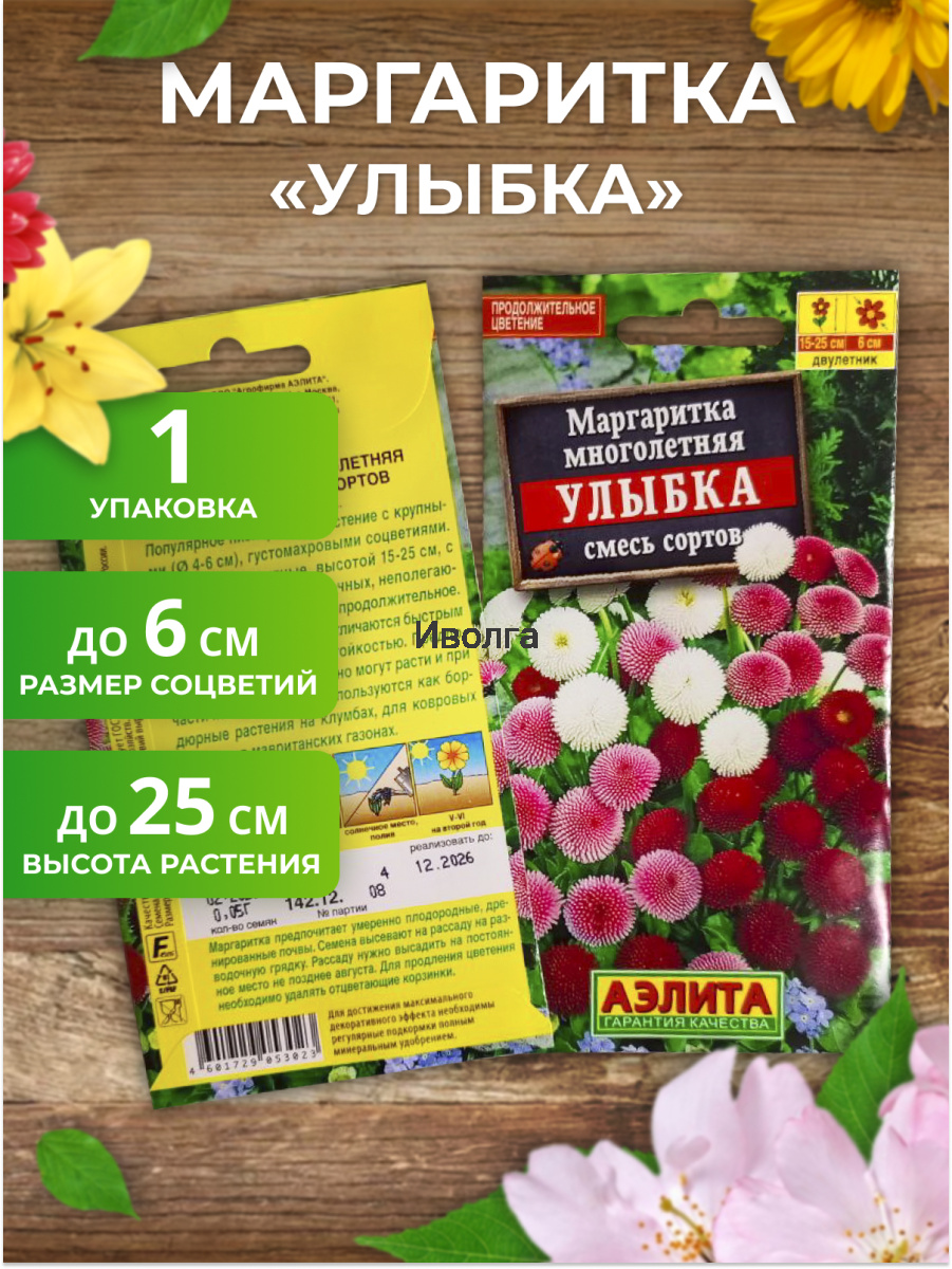 Маргаритка многолетняя "Улыбка" смесь сортов - это смесь сортов нескольких окрасок: 30% белых, 30% бордовых, 40% розовых. Двулетник. Вырастает до 13 см в высоту. Период цветения приходится на второй год мая до июня. Цветки густомахровые, в диаметре до 6 см. Выращивают через посев семян в открытый грунт или рассадным способом. Любит светлые места.