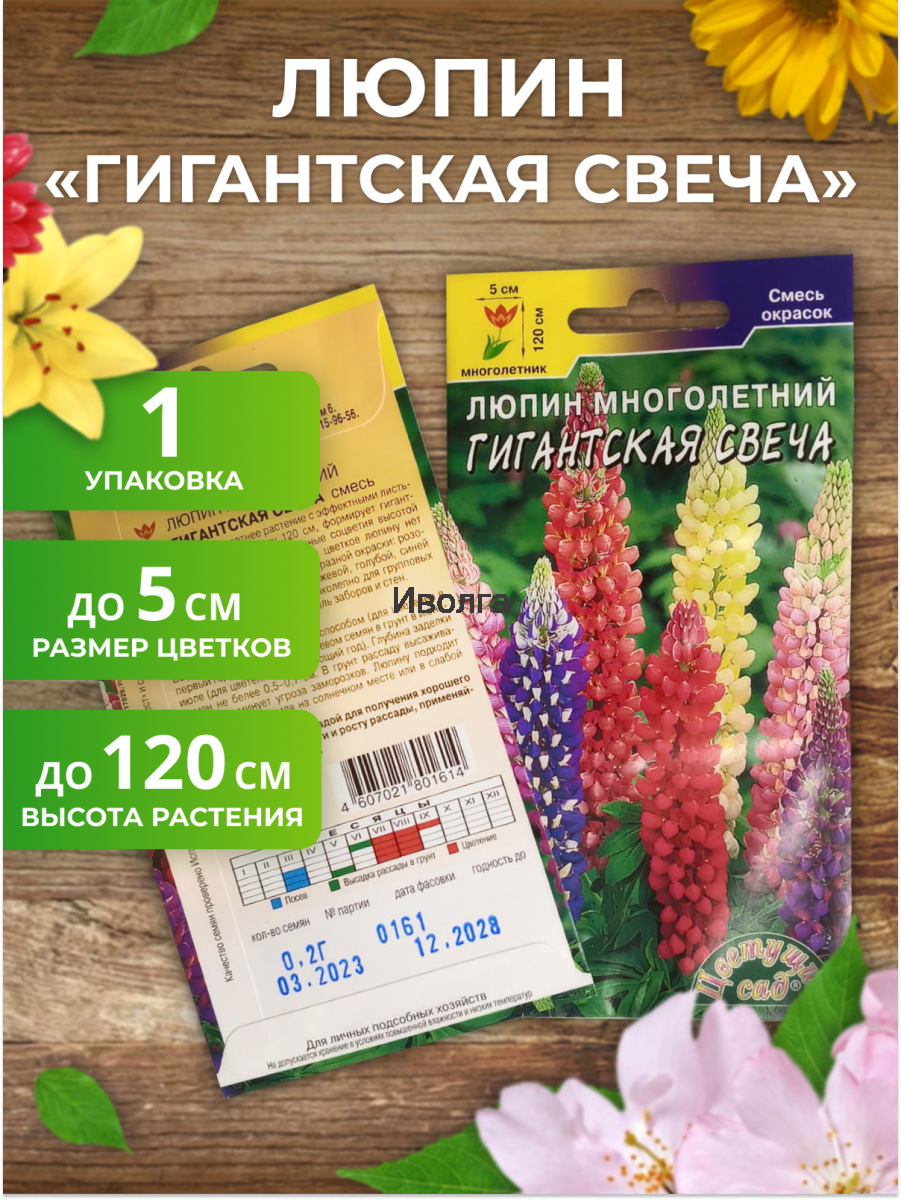 Люпин многолетний "Гигантская свеча" - многолетнее крепкое декоративное растение с эффектными листьями, достигающее высоты 100 – 120 см. Соцветия разнообразной окраски – розовой, белой, кремовой, алой, оранжевой, голубой, синей и фиолетовой. Цветки формируют разноцветные гигантские цилиндрические, колосовидные соцветия высотой до 50 см. Люпин «Гигантская свеча» подходит для групповых посадок, для создания бордюров и живых изгородей.