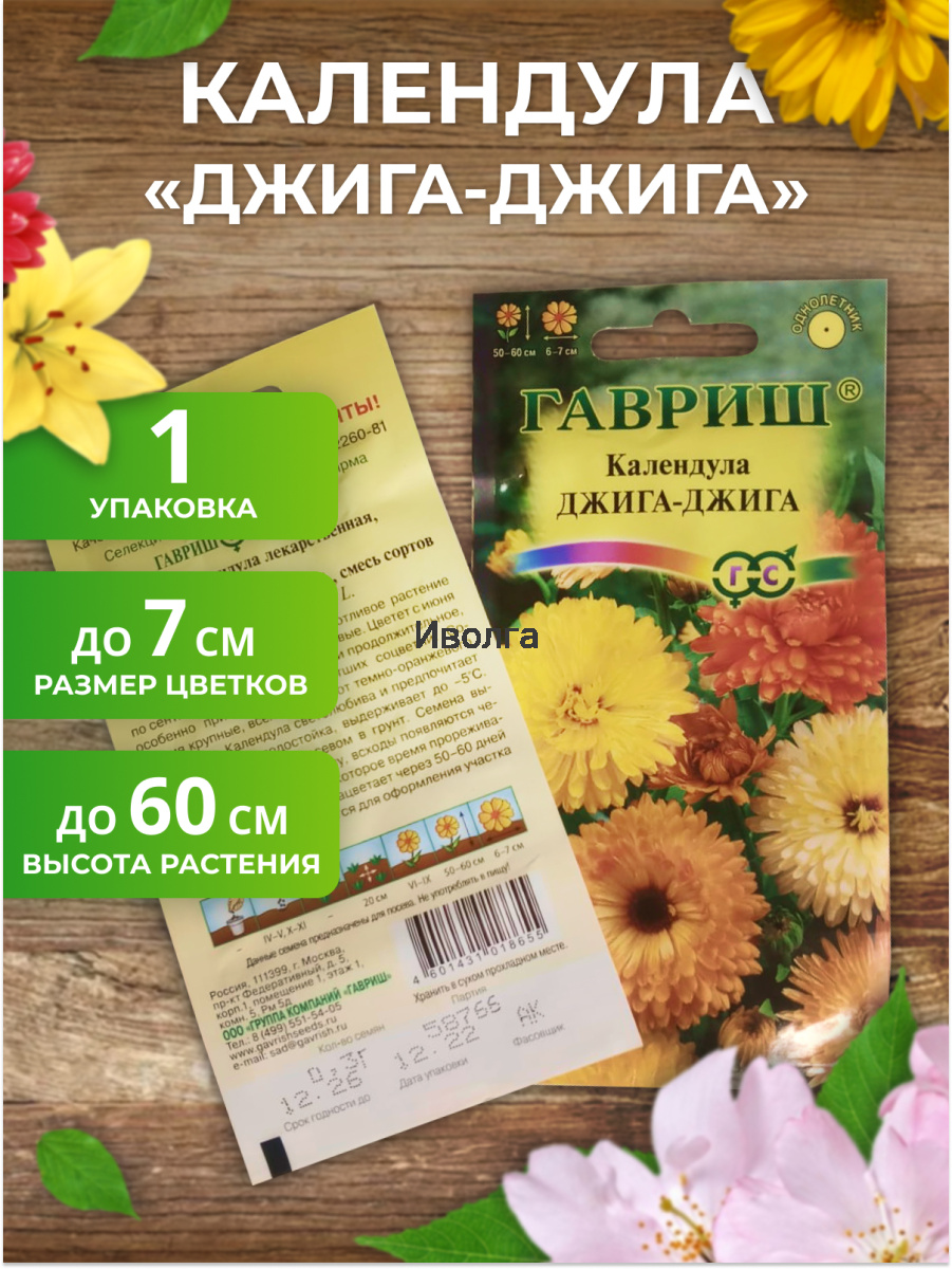 Календула "Джига-Джига" - популярное неприхотливое растение из семейства Астровых. Цветет с июня по сентябрь. Цветение обильное и продолжительное, особенно при удалении отцветших соцветий. Соцветия крупные, всех оттенков от темно-оранжевого до желтого. Календула светолюбива и предпочитает легкие почвы, холодостойка выдерживает до -5°C. Размножают прямым посевом в грунт.
